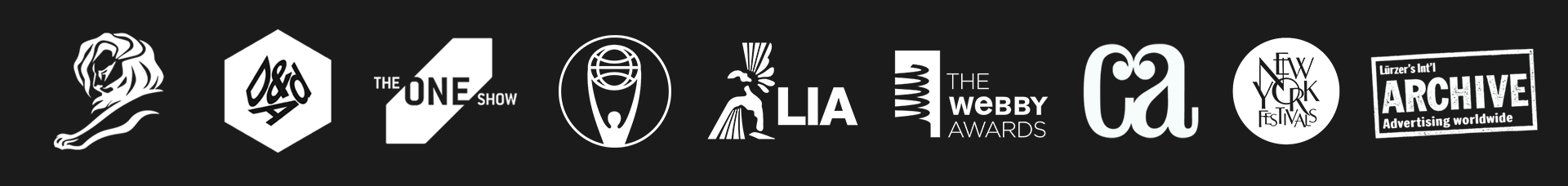 Cannes Lions, D&AD, One Show, Clios, Webbys, Communication Arts, LIAs, New York Festivals, AICP, Epica Awards, Effies, Radio Mercury, PRINT, El Ojo, El Sol, FIAP, Wave and an Emmy Nominee.